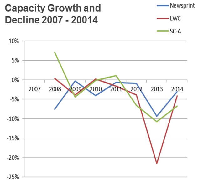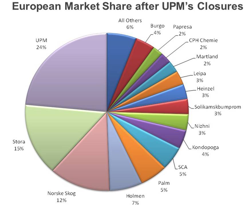 (Editor's Note: This article is courtesy of Fisher International) By Urban Lundberg On November 13, 2014, UPM announced that they, as part of a major profit improvement initiative, will remove over 800,000 MT per year from the European publication paper market by permanently shutting down four paper machines in 2015. The machines affected are the newsprint machines PM 3 in Chapelle, France, and PM 1 at Shotton, UK. In addition, the SC producing PM 5 in Jämsänkoski, and the Coated Mechanical PM 2 in Kaukas, both in Finland, are to be shut down. The closures represent over 14 percent of UPM’s capacity in newsprint and SC-A grades, and 10 percent in LWC. The European publication paper market, consisting of newsprint and printing and writing grades, has a current capacity of about 43.4 million MT (Figure 1), and has been suffering from declining market demand and low operating rates. Once the UPM closures take effect, the specifically affected grades (newsprint, LWC, and SC-A grades) will have experienced a collective decline in European capacity of 17 percent in the three years 2012 to 2014. Newsprint capacity will have declined 12 percent, LWC an astonishing 25 percent, and SC-A grades 17 percent. Together, the affected grades represent 43 percent of the total European capacity for printing and writing and newsprint. One in every six tons of affected European capacity has been shuttered in just three years. This dramatic decline helps to bring supply and demand closer into balance since demand declines out-paced supply closures for several years before 2012. But are the closures enough? Seventeen percent in three years sounds like a lot. However, in markets where demand could be declining at about that rate, the last three years of closures may actually just keep pace. Moreover, since there already was significant overcapacity in 2012, and since markets continue to decline, still more will be needed. Figure 2 shows why: the pace of closures was much slower than demand declines until 2013. ![]() There has been a continuous capacity decline since 2007. Source: FisherSolveTM © 2014 Fisher International, Inc. UPM’s overall market share for the affected grades will, after the closures, be 24 percent and their clear number one position will remain unchanged (Figure 3). Notice how many players hold small market shares and how few (UPM, Stora Enso, and Norske Skog) hold shares greater than 10 percent, indicating a still fragmented market.