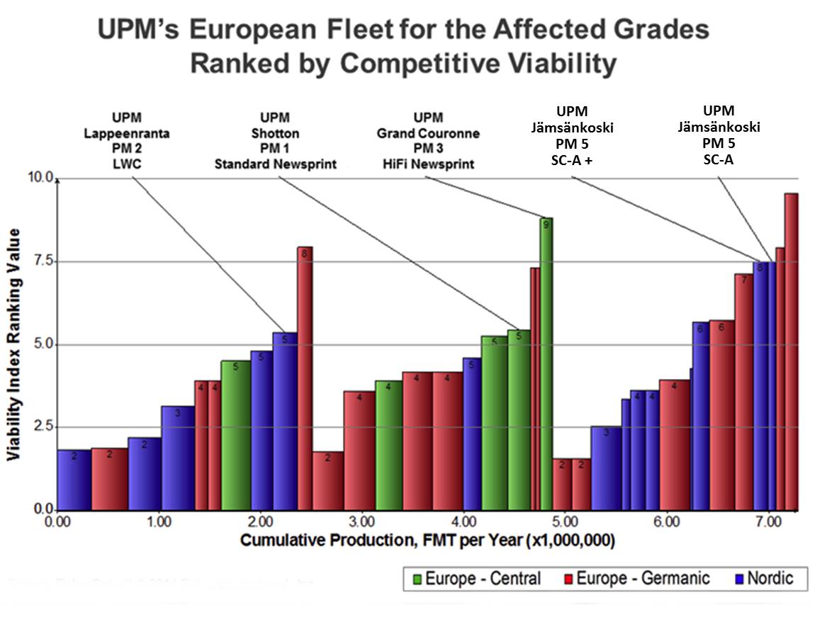 FisherSolve™ Benchmark Viability shows that UPM closed its weakest performers, sparing only a couple of weak assets located in Germany (red bars), most likely because their location provides better logistics advantages than the Finnish assets that will close. Source: FisherSolveTM © 2014 Fisher International, Inc.